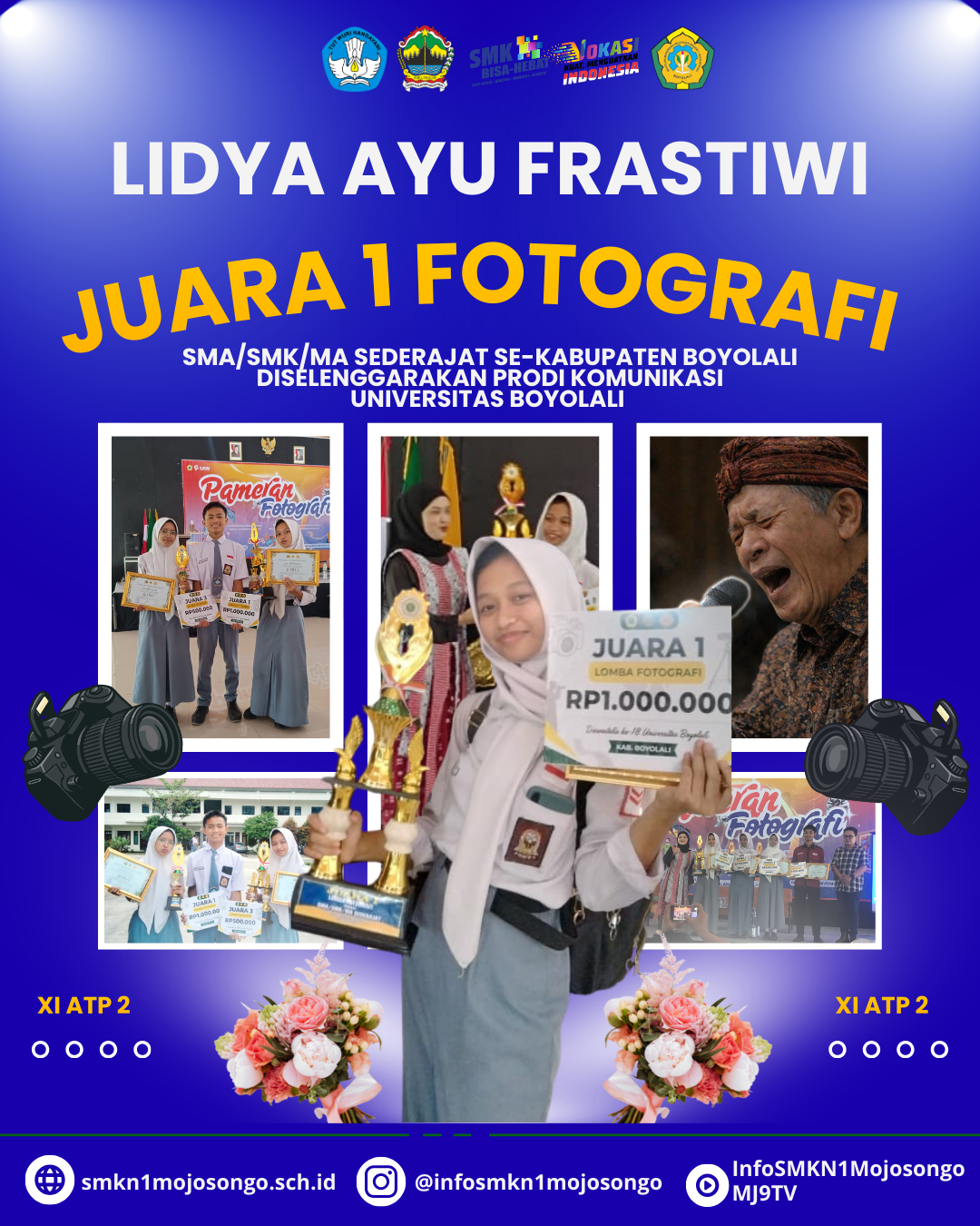 Prestasi membanggakan kembali ditorehkan oleh siswa SMK Negeri 1 Mojosongo. Dalam Lomba Fotografi tingkat SMA/SMK/MA se-Kabupaten Boyolali yang diselenggarakan oleh Program Studi Ilmu Komunikasi Universitas Boyolali, perwakilan SMKN 1 Mojosongo berhasil memborong dua juara sekaligus, yakni Juara 1 dan Juara 3. Juara 1 diraih oleh Lidya Ayu Frastiwi dari kelas XI ATP 2. Menariknya, Lidya…