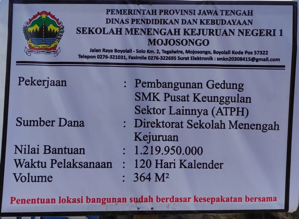 Proses pembangunan secara simbolis ditandai dengan peletakan batu pertama oleh Kepala Cabang Dinas Pendidikan Jawa Tengah Wilayah V yaitu Dr. Sadimin, S.Pd., M.Eng. dibersamai oleh Kepala Sekolah SMKN 1 Mojosongo yaitu Drs. Kamaruddin, M.Pd.