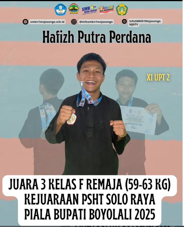 SMK Negeri 1 Mojosongo kembali menorehkan prestasi membanggakan melalui para siswanya pada Kejuaraan PSHT se-Solo Raya Piala Bupati Boyolali yang digelar pada 27–28 Desember 2025 di Boyolali. Dalam ajang tersebut, Aditya Indra Febriansyah (kelas XII TM 1) berhasil meraih Juara 1 Kelas B Dewasa (51–55 kg), disusul Marvelino Raditya Indraguna (kelas XI ATPH 2) yang juga meraih Juara 1 Kelas H Remaja (67–71 kg). Selain itu, Faiz Cahyo Romadhon (kelas XII UPT 1) berhasil meraih Juara 2 Kelas B Remaja (43–47 kg), serta Hafiz Putra Perdana (kelas XI UPT 2) yang meraih Juara 3 Kelas D Remaja (59–63 kg). Selamat!