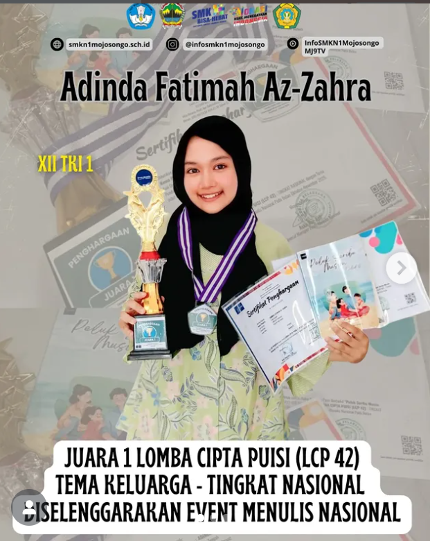 SMK Negeri 1 Mojosongo kembali menorehkan prestasi membanggakan melalui para siswanya pada Kejuaraan PSHT se-Solo Raya Piala Bupati Boyolali yang digelar pada 27–28 Desember 2025 di Boyolali. Dalam ajang tersebut, Aditya Indra Febriansyah (kelas XII TM 1) berhasil meraih Juara 1 Kelas B Dewasa (51–55 kg), disusul Marvelino Raditya Indraguna (kelas XI ATPH 2) yang juga meraih Juara 1 Kelas H Remaja (67–71 kg). Selain itu, Faiz Cahyo Romadhon (kelas XII UPT 1) berhasil meraih Juara 2 Kelas B Remaja (43–47 kg), serta Hafiz Putra Perdana (kelas XI UPT 2) yang meraih Juara 3 Kelas D Remaja (59–63 kg). Selamat!